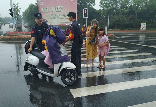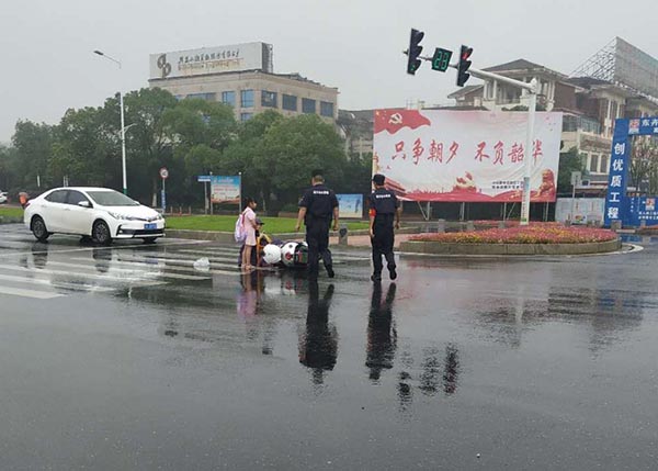 恰巧此時(shí)公司駐高新區(qū)城市綜合管理大隊(duì)隊(duì)員何小保、胡軍、王攀、嚴(yán)敏軍四人駕駛巡邏車途經(jīng)此處例行巡查任務(wù),只見(jiàn)一輛電動(dòng)車倒在馬路中間,一名女子坐在地上,神情慌張無(wú)助,旁邊還站著一名兒童。因正下著小雨,又正值上班早高峰,往來(lái)車輛較多,如不及時(shí)移開(kāi),很容易發(fā)生二次事故和交通擁堵。隊(duì)員不敢多想,立即靠邊停車,主動(dòng)跑上前協(xié)助,一面引導(dǎo)往來(lái)車輛避開(kāi)通行,確保現(xiàn)場(chǎng)人員安全,一面詢問(wèn)人員受傷情況,安撫人員情緒,將陳女士和電動(dòng)車扶起轉(zhuǎn)移到路邊安全區(qū)域,通過(guò)了解得知是發(fā)生交通事故且肇事車輛逃逸,所幸陳女士母女只是簡(jiǎn)單的擦傷。我隊(duì)員協(xié)助撥打報(bào)警電話,再次確認(rèn)傷者并無(wú)大礙后,默默轉(zhuǎn)身繼續(xù)投入到工作中。