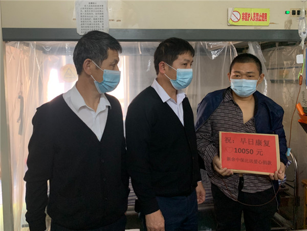 11月10日,集團總公司劉華、張慶受總裁的委托會同新余公司工會主席彭曉峰、副主席張志文驅車前往南昌探望老喻,將公司愛心捐款20050元交到老喻手中,并叮囑他安心接受治療,公司領導和同事都在關心著他,鼓勵他在困境中迎難而上,激發出戰勝疾病的信心和力量。